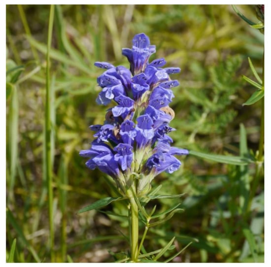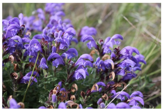 The habitat of Dracocephalum ruyschiana L. extends far to the north; its growth was noted in the Lena and Vilyui river basins, in grass, larch, birch, and mixed forests and meadow steppes. This species has erect stems 20–55 cm high, sparsely shortly pubescent at the nodes and in the upper part, with shortened vegetative shoots in the leaf axils. Dracocephalum ruyschiana forms continuous “carpet” populations in the Amga River valley in the conditions of Central Yakutia (N 60°31′09.0″ E 131°26′26.7″) (Figure 2). Kakasy et al. (2006) identified the composition of D. ruyschiana L. extracts using HPLC and GC–MS with particular emphasis on their flavonoids, aliphatic, aromatic carboxylic acids, and sugars. GC–MS analysis identified and quantified as the main components monosaccharides, sugar alcohols, disaccharides, and trisaccharides, 33 components in total [].