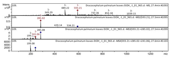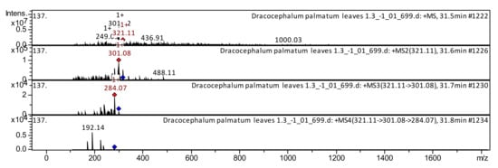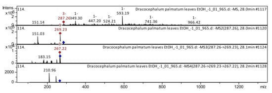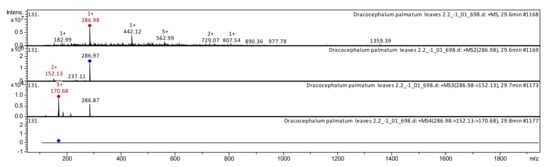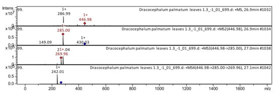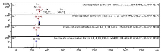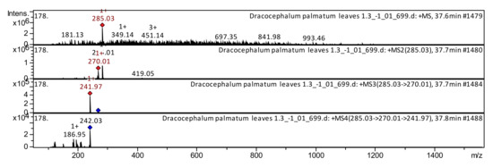 The flavones apigenin (compound 2) and diosmetin (compound 7) have already been characterized as a component of Andean blueberry [], Lonicera japonicum [], Mexican lupine species [], Cirsium japonicum [], Mentha [], and Dracocephalum moldavica []. The flavone apigenin was found in extracts of D. palmatum and D. ruyschiana. The flavone diosmetin was found in extracts of D. palmatum. The CID spectrum in positive ion modes of diosmetin from extracts of D. palmatum is shown in Figure 3.