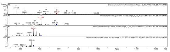 | № | Variety of Dracocephalum | Class of Compounds | Identified Compounds | Formula | Mass | Molecular Ion [M − H]− | Molecular Ion [M + H]+ | 2 Fragmentation MS/MS | 3 Fragmentation MS/MS | 4 Fragmentation MS/MS | References |