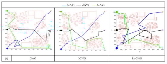In this section, the proposed path planning methods are analyzed based on the cost function, introduced in Equation (3). The results obtained are presented in Table 2. The starting and ending points of UAVs are assumed to be different from each other. In this table, the costs for these autonomous robots were obtained from a set of various populations and iterations. This process was evaluated for all algorithms used. According to the results obtained, the Ex-GWO-based method achieved the best result compared to other used path planning methods. The Ex-GWO-based method gave the best solution in five of the assumed nine scenarios and ranked first among the three methods with a 55.56% success rate. In the ranking, the I-GWO-based method was second with 38.88% and the GWO-based method was third with 5.56%. These results are presented in Table 3.
