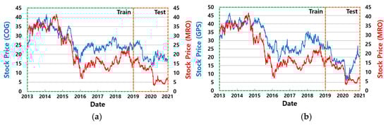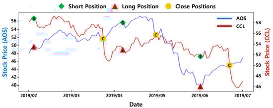 Pairs trading is a statistical arbitrage strategy that exploits short-term price divergences between a pair of assets that have historically moved together. In the stock market, pairs traders simultaneously open a short position in an overvalued stock and a long position in an undervalued stock. When the prices of the two stocks converge, the opened positions are closed by taking the opposite positions. Figure 1 illustrates the similar price movements of a stock pair of A. O. Smith Corp. (AOS, Milwaukee, WI, USA) and Carnival Corp. (CCL, Miami, FL, USA) in the Standard & Poor’s (S&P) 500 index, which is a collection of the stocks of 500 large companies in the United States. As shown in the figure, pairs trading exploits divergence and convergence movements using both long and short positions.