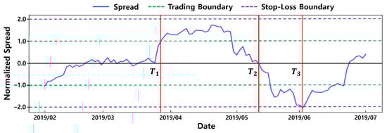 To find stock pairs with arbitrage opportunities, we check whether the spread, which is the difference between the prices of two stocks, forms a mean-reverting stationary process. Figure 2 illustrates the normalized spread of the stock pair shown in Figure 1. Traditionally, pairs trading methods open positions when the spread touches a trading boundary (e.g., in Figure 2), which is predetermined as a constant multiple of the standard deviation of the spread. The constant value may vary for different pairs-trading methods. When the spread returns to the mean (e.g., in Figure 2) or the specified trading window ends, the positions are closed. The spread may diverge too far from the mean (e.g., in Figure 2), possibly resulting in a great loss. To limit potential losses in such situations, pairs trading methods set stop-loss boundaries to close the positions by force.