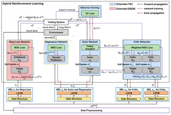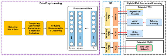 Figure 3 illustrates the architecture of HDRL-Trader for pairs trading in a stock market environment. For data preprocessing, we apply dimensionality reduction and clustering to extract robust features. For SRL, we use a gate structure, LSTM layer, and regression network to generate states from the features. For hybrid reinforcement learning, we combine extended versions of the TD3 and DDQN algorithms. Each component is explained in detail in the following subsections.