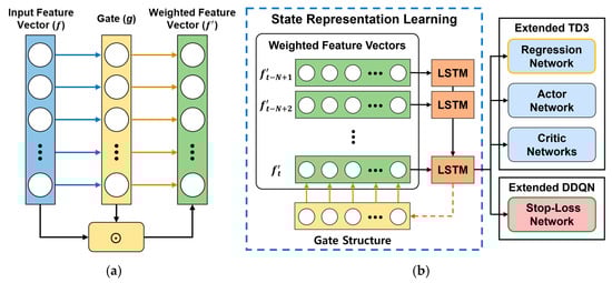 State representation is crucial for reinforcement learning. To observe historical spread movements, our SRL model takes a sliding window of preprocessed data, as shown in Figure 3. To adaptively select features, we assign a weight to each feature using the gate structure [34]. The gate shown in Figure 5a is defined as in Equation (20) where is the input feature vector, and are parameters learned by end-to-end training, and is a sigmoid activation function. Using gate , we generate the weighted feature vector from the element-wise multiplication () of vectors and in Equation (21).