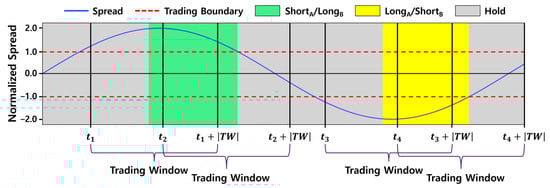 Algorithmic trading enables pairs traders to execute complex trading strategies without human intervention. In recent years, deep reinforcement learning has received considerable attention in the field of algorithmic trading because it has both the perception ability of deep learning and the decision-making ability of reinforcement learning. Pairs trading methods based on deep reinforcement learning can be classified into two approaches: (1) indirectly determining trading actions, such as long and short, based on the trading and stop-loss boundaries [1,2] and (2) directly determining trading actions based on the spread [3,4,5]. The former approach has a fixed gap between the trading and stop-loss boundaries, as shown in Figure 2, which is certainly not optimal because the trading boundary is completely dependent on the stop-loss boundary. The latter approach has no stop-loss boundaries, which presents the risk of a great loss.