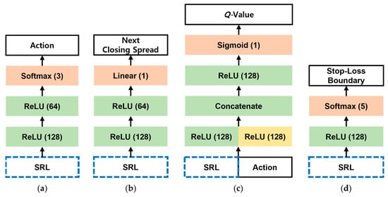 Figure 7 illustrates the proposed architecture for hybrid reinforcement learning, which combines the extended TD3 and DDQN algorithms. The extended TD3 algorithm uses an actor network , SRL network for , regression network that shares with the actor network, two critic networks and , and two SRL networks and for and respectively. The actor network is trained with behavior cloning. The extended DDQN algorithm uses a Q-network for the stop-loss boundary (called the stop-loss network) and the SRL network for . All networks, except the regression network, have corresponding target networks. In Figure 7, the SRL networks correspond to the sensors, and the trading system corresponds to the effector. Figure 8 shows the structure of each network.