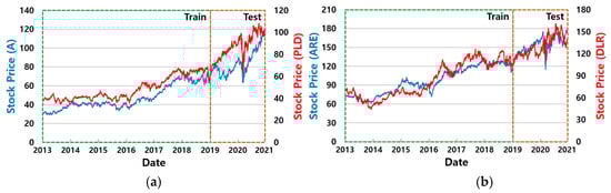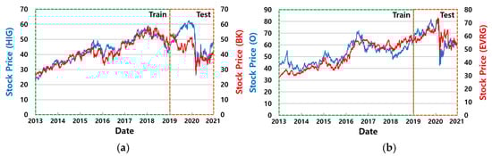 Pairs trading is a popular market-neutral trading strategy that uses highly correlated and cointegrated stock pairs. If two non-stationary time series (i.e., stock prices) are cointegrated, we can combine them into one stationary time series (i.e., a spread) according to Equation (1). The augmented Dickey–Fuller test [8] is widely used to analyze whether a time series is stationary. In Equation (1), PA and PB are the prices of stocks A and B, respectively, and is the cointegration factor (or hedge ratio).