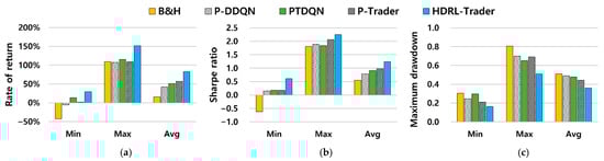 | B&H | P-DDQN | PT-DQN | P-Trader | HDRL-Trader | B&H | P-DDQN | PT-DQN | P-Trader | HDRL-Trader | B&H | P-DDQN | PT-DQN | P-Trader | HDRL-Trader | |