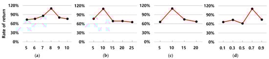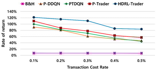 In a real trading environment, there are transaction costs, such as fees, taxes, and trading slippages. Here, slippage is the difference between the expected price and actual price at which a trade is executed. The transaction cost is factored into the stock price, as in Equation (23), where is the transaction cost rate used to discount the price. The discounted price is applied when the stocks are sold.