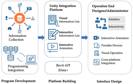 In order to achieve the above objectives, we conducted program development and platform construction in Section 3 of this study and proposed the method of information collection and programming integration. We also simulated the use scenario of the Unity integration platform, determined the purpose of using the platform, and wrote interactive scripts to complete the platform pre-construction. In the following Section 4, this study conducted an interactive interface design, set up the visual and interactive information environment in the Unity integration platform, and simultaneously developed and designed the plug-in programming interface in Revit to facilitate accurate information transmission between Revit and the Unity integration platform, in order to make the integration process more logical and easier to navigate (Figure 1).