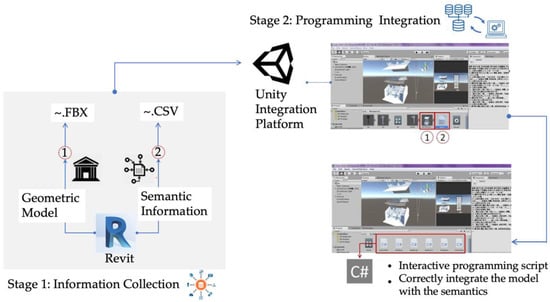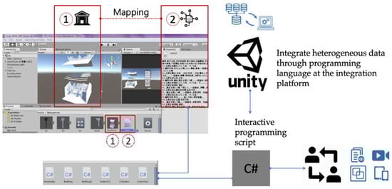 Completion of the information collection at Stage I was followed by the programming integration stage (Figure 2). This study used the Unity 3D game engine as the integration platform to build an interactive environment for the information models of historic buildings, where the geometric model (.FBX) (refer to the circle number 1 marked on the left in Figure 6) and non-geometric semantic information (.CSV) (refer to the circle number 2 marked on the left in Figure 6) collected in Stage I were imported into the game engine, and the geometric model and corresponding non-geometric semantic information were correctly integrated through Unity C# programming language (Figure 6).
