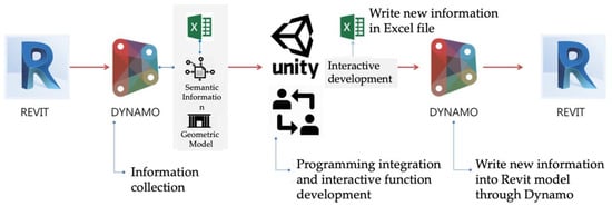Moreover, our research team has exhausted a lot of experience due to two related previous works [5,20], mentioned in the literature section of this article. The former [5] completed the development of the Revit plug-in interface API, and the latter [20] tried to import the information model into the Unity platform for the integration of geometric models and non-geometric semantics. The purpose of this research is to continue the accumulation of related research. This research uses the former’s Revit information model [5], based on the former’s experience in developing the Revit API [5] and the latter’s experience in importing the model into the Unity platform [20], and tries to combine the Revit API with the Unity platform and develop an interactive interface.