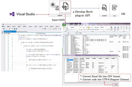 Therefore, Visual Studio was used for advanced development at the second stage of this study, where the information collection package of non-geometric semantics is subject to parameter collection and format conversion by capturing the parameters of the components through the Visual Studio program of Revit’s plug-in programming interface (API) (Figure 4). Thus, users only need to click the export model information button built in the Revit’s plug-in application panel to complete information collection, which simultaneously uploads the semantic model information to the cloud service framework (WebAPI) (Figure 5). This function simplifies the operation and workflow, solves difficulties in application and reduces the operation threshold, simplifies the information collection process, makes it easier for the user to operate, makes information transmission more direct, preliminarily builds the follow-up interactive functions, and strengthens the application of the front end.