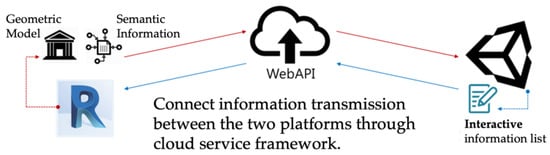 WebAPI helps in enabling the development of HTTP services to reach out to client entities such as browsers, devices, or tablets. The function of Web API here can not only reduce the burden of computer calculations, but also instantly update the model information to the integrated platform. The following figure (Figure 5) shows the transmission process between the Revit model information and the Unity integrated platform. The model information collected during the collection phase can be uploaded to the cloud storage space in real time, and the model information in the cloud can be automatically captured during the programming integration phase. In addition to strengthening the connection between the information model in Revit and Unity integrated platform, the cloud service also increases the applicability of model information.