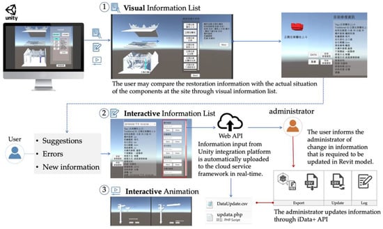 Taking users’ implementation of the integration platform project at the restoration site as an example (Figure 7): (1) The user can review the information of any restored components or components awaiting restoration in the project through the “visual information list” option (refer to the circle number 1 marked in Figure 7), conduct comparisons of the actual components at the restoration site, and browse components at various stages of restoration. (2) When the user finds any error in the component information and has to revise the component information or add restoration suggestions, the user can input and store the updated information content through the text box in the “interactive information list” (refer to the circle number 2 marked in Figure 7), and the updated information will be automatically uploaded in real-time to the cloud service framework (WebAPI). The restoration information may be added or overlain continuously through such lists and may be compared with the restoration information of the same component at different stages in the list. Upon completion of information updating on the platform, the user updates the Revit model information through the plug-in programming interface (iData+) of the platform administrator. (3) Since the Revit platform only has the function of viewing the model, this platform provides the application of the “interactive animation” option (refer to the circle number 3 marked in Figure 7). In addition to providing simple animation of the camera path, it also provides interactive animation of the disassembly and assembly of building components, which is more in line with the needs of restoration designs for historic buildings and assists in the communication between the design end and the construction end. In the future, its function development may be customized according to the user’s needs.