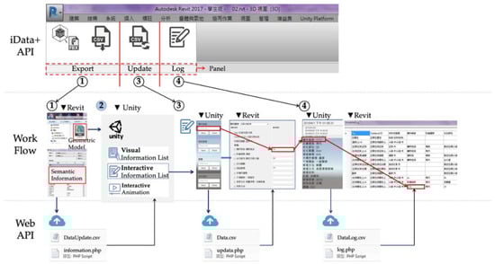 This study developed a plug-in application interface (API) named “iData+” in Revit software and imported the Visual Studio from the information model into the Unity integration platform, which was subsequently returned to the Revit software for information updating, and thus, reducing the difficulties and barriers in the platform operation and software, and simplifying the workflow to the maximum. Currently, three function panels are set on iData+ API: “Export model (Export)” (refer to the circle number 1 marked in Figure 8), “Update model information (Update)” (refer to the circle number 3 marked in Figure 8), and “Revise model Log (Log)” (refer to the circle number 4 marked in Figure 8). This panel contains four function buttons, and new functions may be added to the platform management end in the future. The functions and applications of the buttons are explained in the following paragraphs (Figure 8).