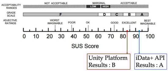 This section is explained based on the above expert interview results. First, the questionnaire results are divided into six grades according to the SUS calculation method [26], which presents the calculation and evaluation results of the usability of the system built in this study. According to the statistical results of the questionnaire (Figure 9), the Unity integration platform helps to expand the application of the BIM models of historic information, which uses game technology to visualize information and develop interactive functions, strengthens the interaction between the user and information, includes restoration information for added value, and effectively reduces the difficulty of traditional BIM operation. The dynamic and static perspective switch provided by the platform improved the interactive experience between the user and the model, and information can be accurately transmitted between Revit and the Unity integration platform through the iData+ application interface. The automatic bi-directional information transmission function makes the integration process more logical and easier to operate. The interface application design is relatively user-friendly and achieves the design purpose of providing the user with information interaction. Intensifying the application of value-added information brings more possibilities for the restoration and conservation of historic buildings in the future.