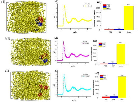 The results show that, Cu–Au alloy at temperature (T), T = 300 K with a calcination rate of 4 × 1012 K/s, time each move step (h), h = 1.0 fs has the structure shape (Figure 2(a1)), the radial distribution function with rCu–Au = 2.58 Å, the height of the RDF was gCu–Au(r) = 4.62, size (l), l = 8.33 nm, Etot = −193 eV (Figure 2(a2)) and the structural units number was 63 FCC, 100 HCP, and 2753 Amor (Figure 2(a3)). When the time for each move step, h, was increased from h = 1.0 fs to 1.5, 2.0, 2.5, and 3.0 fs, the shape of the structure changes (Figure 2(a1,b1,c1,d1,e1)), the length link of Cu–Au increased from rCu–Au = 2.58Å to rCu–Au = 2.62, 2.62, 2.64, and 2.66Å, respectively, the height of the RDF increased from gCu–Au(r) = 4.62 to gCu–Au(r) = 4.98, 5.03, 5.14, and 5.22, respectively, the material size increased from l = 8.33 nm to l = 8.34, 8.35, 8.35, and 8.36 nm, respectively, total the energy of the system increased a little from Etot = −193 eV to Etot = −193, −193, −193, and −194 eV, respectively (Figure 2(a2,b2,c2,d2,e2)), and the structure units number changed: FCC increased from 63 FCC to 63, 160, 334, and 537 FCC; HCP increased from 100 HCP to 103, 195, 191, and 256 HCP; Amor decreased from 2752 Amor to 2751, 2561, 2391, and 2123 Amor (Figure 2(a3,b3,c3,d3,e3)). The reason for this phenomenon was that increasing the time of each heating step leads to increased in the displacement transition time of each MD step, giving the Cu and Au atoms bonding time. This shows that increasing h leads to increased crystallization, shown by increasing the length of Cu–Au links, increasing the number of FCC and HCP structural units, and decreasing this number for Amor. These results show that there was a very great influence on the time of each heating step, but the increase in the time of each heating step leads to a strong increase in total simulation time. The time of each heating step is not workable in the current time of computer speed configuration, and we choose the time of each heating step as h = 3.0 fs as a standard to study for other influence cases.