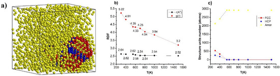 The structural shape (a), radial distribution function (b), and number of structural units (c) of Cu–Au alloy at heating rate 4 × 1012 K/s, time per heating step h = 3.0 fs with different values of temperature.