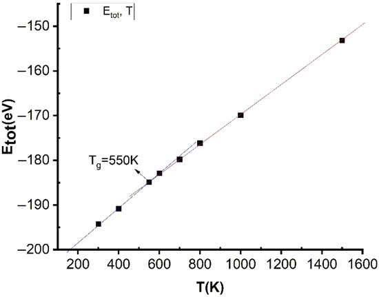 The obtained results show that when T increased from T = 300 K to T = 400 K, 550 K, 600 K, 700 K, 800 K, 1000 K, and 1500 K, the size, l, has an insignificant change value in range from l = 8.36 nm to l = 10.01 nm, and Etot increased from Etot = −194 eV to Etot = −190, −185, −182, −178, −176, −168, and −154 eV, respectively. In consequence, these results show that, with T < 550 K, Cu–Au alloy exists in the crystalline state and for T > 550 K was in a liquid state. Where, the structural shape of Cu–Au alloy at T = 550 K was amorphous. The intersection of the two lines of crystallization and the line in the liquid state is at a point, T = 550 K, which was called the crystallization point or the glass temperature (Tg), Tg = T = 550 K (Figure 4). At the glass point, Tg = 550 K has the total energy of the system Etot = −185 eV, results consistent with the value of crystallization temperature of Cu–Au T = 543 K [48] and in the range from T = 543 K to T = 683 K [60,61]. The obtained results show that the choice of embedded interaction potential Sutton–Chen (SC) is completely appropriate.