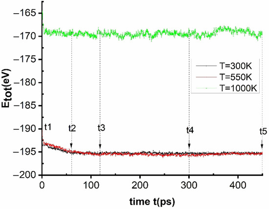 The obtained results show that, at the initial time without annealing, t1 = 0 ps, the energy of the material at temperature T = 300, 400, 550, 600, and 1000 K has the corresponding energy value Etot = −198, −196, −192, −190, and −182 eV, respectively. When the annealing time was increased from t1 = 0 ps to t2 = 60 ps (2 × 104 MD steps), t3 = 120 ps (4 × 104 MD steps), t4 = 300 ps (10 × 104 MD steps), and t5 = 450 ps (15 × 104 MD steps), the total energy of the material in the corresponding temperatures have variable values (Figure 5). When the temperatures T = 400, 600, and 1000 K, the values change are not significant. When T = 300 and 550 K, the energy of the material decreased rapidly from the point t1 = 0 ps to t2 = 60 ps, and after that gradually slows down from t2 = 60 ps to t3 = 120 ps, whereas from t3 to t4, t5 was almost constant. It follows that the material has a strong crystallization process at the temperature T = 550 K—namely, this was the phase transition of the material’s crystallization with Tg = 550 K. At temperatures T = 300 and 400 K, the crystallization process occurs slowly; finally, at T > 600 K, crystallization does not occur because this was the region where the material has changed to a liquid state. To confirm that, we examined the structure and crystallization process at each specific temperature and the results are shown in Figure 6.