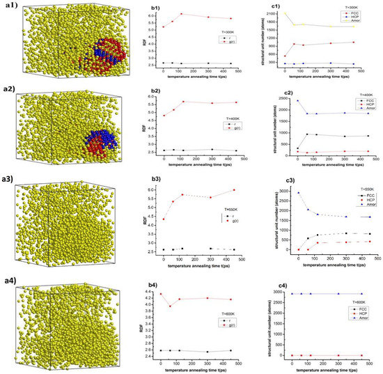 The structural shape (a1,a2,a3,a4,a5), radial distribution function (b1,b2,b3,b4,b5), and number of structural units (c1,c2,c3,c4,c5) of Cu–Au alloy at heating rate 4 × 1012 K/s, time per heating step h = 3.0 fs, and the values of temperature T = 300, 400, 550, 600, and 1000 K.