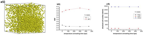 The results show that Cu–Au alloy at temperature (T) T = 300 K with a calcination rate 4 × 1012 K/s, time per heating step (h), h = 3.0 fs at heat annealing time (t), t1 = 0 ps has the structure shown in Figure 6(a1), the radial distribution function with rCu–Au = 2.66 Å, the height of the RDF was gCu–Au(r) = 5.22, size (l), l = 8.36 nm, Etot = −198 eV, and the number of structural units was 537 FCC, 256 HCP, and 2123 Amor. When increasing the heat annealing time t from t1 = 0 ps to t2 = 60 ps, t3 = 120 ps, t4 = 300 ps, and t5 = 450 ps, the length link of Cu–Au decreased from rCu–Au = 2.66 Å to rCu–Au = 2.66, 2.62, 2.64, and 2.66 Å, respectively, the height of the RDF increased from gCu–Au(r) = 5.22 to gCu–Au(r) = 5.61, 6.15, 5.92, and 5.82, respectively, the material size decreased from l = 8.36 nm to l = 8.33, 8.3, 8.33, and 8.32 nm, respectively, the total the energy of the system change decreased from Etot = −198 eV to Etot = −195, −195, −195, and −195 eV, respectively, and the number of structural units changed: FCC increased from 537 FCC to 984, 942, 1010, and 1048 FCC, respectively, and HCP change increased from 256 HCP to 243, 262, 275, and 242 HCP, respectively, whereas for Amor it decreased from 2123 Amor to 1689, 1712, 1631, and 1631 Amor, respectively (Figure 6(b1,c1)). Similarly, with T = 400 K, we considered that the alloy has the structure as in Figure 6(a2), and the length link of Cu–Au change increased from rCu–Au = 2.62 Å to rCu–Au = 2.6 Å, the height of the RDF increased from gCu–Au(r) = 4.81 to gCu–Au(r) = 5.64, the material size remained constant with l = 8.45 nm, the total the energy of the system decreased from Etot = −196 eV to Etot = −191 eV, and the number of structural units changed: FCC increased from 329 FCC to 868 FCC, HCP increased from 183 HCP to 200 HCP, and Amor decreased from 2404 Amor to 1848Amor (Figure 6(b2,c2)). For T = 550 K, considering that the alloy has the structure shown in Figure 6(a3), the length link of Cu–Au decreased from rCu–Au = 2.62 Å to rCu–Au = 2.62 Å, the height of the RDF change increased from gCu–Au(r) = 4.35 to gCu–Au(r) = 6.0, the material size remained almost constant from l = 8.76 nm to 8.36 nm, total the energy of the system decreased from Etot = −192 eV to Etot = −195eV and the number of structural units changed: FCC increased from 0 FCC to 814 FCC, HCP increased from 0 HCP to 422 HCP, and Amor decreased from 2916 Amor to 1680 Amor (Figure 6(b3,c3)). In the case of T = 600 and 1000 K, then the alloy has the structure as in Figure 6(a4,a5), the length of the link of Cu–Au does not change with rCu–Au = 2.58 Å, the height of the RDF change decreased from gCu–Au(r) = 4.33 to gCu–Au(r) = 4.16, the material size remained constant with l = 8.87 nm, total the energy of the system decreased from Etot = −190 eV to Etot = −182 eV, and the number of structure units did not change with 0 FCC, 0 HCP, and 2916 Amor (Figure 6(b4,c4)). With T = 600 K and with T = 1000 K then, the length of the link of Cu–Au decreased from rCu–Au = 2.66 Å to rCu–Au = 2.54 Å, the height of the RDF increased from gCu–Au(r) = 3.92 to gCu–Au(r) = 4.14, the material size remained constant with l = 9.52 nm, total the energy of the system decreased from Etot = −182 eV to Etot = −169 eV, and the number of structure units no changed with 0 FCC, 0 HCP, and 2916 Amor (Figure 6(b5,c5)). The obtained results show that the above predictions are completely consistent with the obtained results, with the cause of the phase transition from the crystalline state to the liquid state, by the size effect and phase transition of the material, is phase transition type 1. The obtained results of Cu–Au alloy can serve as a basis for future experimental studies.