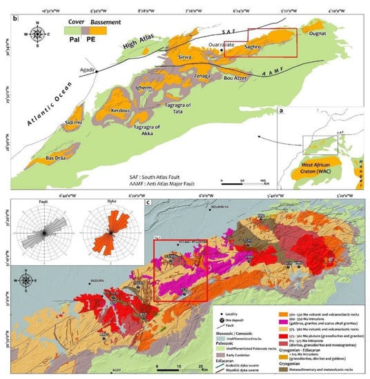 (a) Location of the Moroccan Anti-Atlas Range relative to the West African Craton [33]. (b) General geological map of the Anti-Atlas showing its main Precambrian inliers [34,35], modified. (c) Geological map of the Saghro Massif with its main metalliferous deposits (IMD: Imeter Deposit; TGHD: Taghassa Deposit; KMD: Kelâat M’Gouna Deposits; ISFD: Issarfane; BSD: Bouskour Deposit; AMD: Amzwaro Deposit; TMD: Tizi Moudou Deposit; AFD: Asfalou Deposit; TWD: Tiwit Deposit; TGMD: Tagmout Deposit; SFD: Sidi Flah Deposit). In addition, their rose diagrams showing the trends of faults on the left and dykes on the right. The study area is marked by the red polygon [36,37], modified.