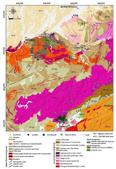 The study area corresponds to the geological sheet of Kelâat M’Gouna, at 1:50,000 scales. It is geographically attached to the Kelâat M’Gouna inlier, between meridians 6°00 W and 6°15 W and parallels 31°00 N and 31°15 N. This area contains a wide range of geological formations ranging in age from Cryogenian to the present day (Figure 2). The Lower Cryogenian formations, which are volcano-sedimentary and metamorphic, are the oldest in the Jbel Saghro massif and correspond to turbidites interbedded with basic volcanic flows and intruded by gabbros, diorites and granites [32,39,40,41,42]. They are overlain in anomalous contact, by Upper Cryogenian conglomerates, sandstones, limestones, cinerites, rhyolites and andesites [36,43], and they are overlain by the formations of the Ouarzazate Group, which in turn, comprises two discordant sets on top of each other [31]. The first set corresponds to the Lower Ediacaran or the Lower Ouarzazate Group, composed of potassium-rich volcanic and granitic formations that intrude all the previous geological formations. The second set corresponds to the Upper Ediacaran or Upper Ouarzazate Group, consisting of detrital and volcanic formations intruded by rhyolite and microgranite dikes. The formations of the Upper Ouarzazate Group are tectonically continuous with the Adoudounian sedimentary formations. The Paleozoic formations are poorly represented in the study area. They are limited to the Tagmout graben (Figure 2), where they are exposed in conglomerates, pink sandstones with basalt intercalation, Paradoxides shales and Tabanites sandstones [31]. The Cenozoic-Quaternary sedimentary deposits correspond to the filling of the Ouarzazate basin.