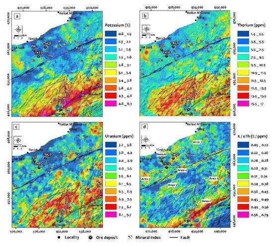 At a too detailed scale, the overall spatial distribution of relative Potassium concentrations suggests that the Lower Cryogenic turbiditic metavolcanic and the Quaternary and Miocene formations show low levels (0.70–2.20%), while intermediate values (2.70–3.70%) are associated with the oldest granites (Wawitcht Granite). High levels (up to 6%) were obtained in NE-trending fault and fracture zones and are related to granites (Figure 4a). The Thorium map reveals that the youngest granites and the Upper Ediacaran rhyolites have the highest values of 16 and 13 ppm, respectively, in which their boundaries are evident (Figure 4b). Lower levels are observed in wadi sediments, metasediments and Cryogenian metavolcanic where concentrations are lower than 6.5 ppm (Figure 4b). The Uranium map can also be subdivided into three levels. The first level extends to 8 ppm, associated with the youngest granites, the volcano-sedimentary complex and the Upper Ediacaran rhyolites. The intermediate level ranges from 4 to 6 ppm, associated mainly with the Ediacaran rhyodacites and rhyolites. The last level decreases to 3 ppm as a minimum value on the Miocene sedimentary formations and the Wadi sediments (Figure 4c).
