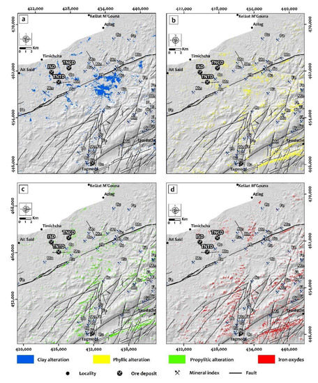 The band ratio (b5/b3) + (b1/b2) shows the surface distribution of iron oxides in red pixels (Figure 4d). Compared with the geological map, the high abundance of all these mapped minerals is typically associated with Cryogenian and Lower Ouarzazate Group units. It shows a strong correlation with the mineral occurrences and prospects in the study area.