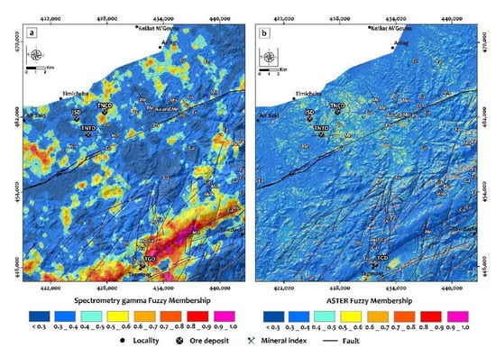 In this study, we applied this analysis to produce mineral prospectivity maps following the methodological approach presented in the Figure 3. The first map combines the four layers corresponding to the band ratios extracted from the ASTER image (Table 3). Meanwhile, the second map combines the geophysical data corresponding to the K, K/eTh ratio and K/eU ratio layers. These layers were fuzzified individually using the linear membership function. Then the fuzzy gamma operator was applied to combine our thematic layers. The choice of this operator is based on the fact that it is a compromise between the fuzzy algebraic sum and its product [72]. In addition, it is possible to develop improvements on the input of the resulting maps [73]. After several trials, we took 0.72 as the value of parameter γ. The fuzzification parameters used for the input data are represented in the Table 4.