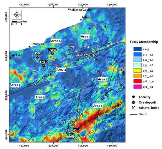 The processing of the geophysical and ASTER data used in the present work is a preliminary step of great importance for recognizing new potential targets for mining research at the scale of the Kelâat M’Gouna inlier. The combination of two different data types allowed us to map in detail the hydrothermal alteration zones associated with the metal deposits, especially the gold deposits. Benziane et al., 2008 [31], showed that the three gold prospects in the study area are associated with hydrothermal alteration phenomena. According to these authors, silicification is expressed either by developing quartz stockworks or by dispersion in the host volcano-sedimentary formations, following a general NE-SW direction. Generally, this silicification is accompanied locally by opening zones filled with potassium feldspar and tourmaline. In this respect, ratios of K/eTh and K/eU were calculated to highlight enrichment zones in this element. Chloritization is manifested by the development of large zones in the soft greenish levels of the volcano-sedimentary series. For this purpose, the Aster image band ratio (b7 + b9)/b8 was calculated to map the spatial distribution of high chlorite content zones. Hematization is materialized by the development of iron oxides and hydroxides, following the fracturing planes, which are generally oriented N20°. This type of alteration mineral was mapped using the band ratio (b5/b3) + (b1/b2). Finally, the band ratio (b5 + b7)/b6 was used to map the sericitization in the study area in a subordinate manner [31]. In the form of thematic layers, this database was fuzzified by the fuzzy logic modelling technique by combining the two mineral prospectivity maps, Aster and radiometric. Subsequently, a mineral prospectivity map for the study area was generated. A total of seven prospective value areas were identified (Figure 7), and they are mainly associated with alteration zones:
