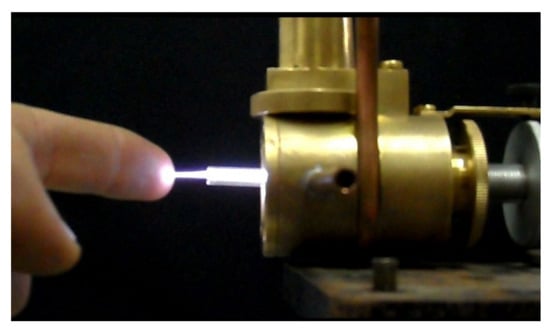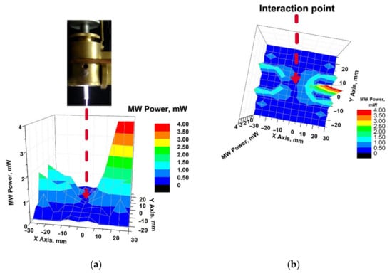 The biggest problem of the microwave plasma torches sustained by a traveling wave that needs systematic investigation is that by using the same (low) wave power and gas flow, in some cases, the temperature at the plasma torch tip is low enough to be touched (Figure 1) and in other cases, can be above 100 °C [25]. In some conditions, only one stable filament exists, while at the same wave power and gas flow, a second filament can appear. Another important difference between the surface wave plasma torch and the MicroPlaSter device [23] is connected with the microwave field used for the plasma ignition. The microwave electric field in MicroPlaSter is applied between electrodes inside a metal container, and the plasma is transported outside the active region by the gas flow. In this way, the treated sample is prevented from the microwave radiation, but only long-living active plasma particles can be used for the treatment process. The surface wave plasma torch is produced by an electromagnetic wave traveling along the plasma with the wave power decreasing along the torch. At low and intermediate pressures, the end of the plasma column is at a position where the wave power becomes zero and the wave cannot propagate anymore. At high and atmospheric pressures, the wave power for sustaining plasma is much higher, and the plasma column ends when the wave power is not enough for sustaining plasma, but usually is not zero. The plasma used for the samples treatment is a part of the active discharge region with all short- and long-living particles produced in the plasma (which can be the reason for obtaining good results at very short treatment time), but also the microwave field there may be too high. It is important to investigate the microwave radiation at the position of the treated sample in order to avoid any possible damage during the treatment.