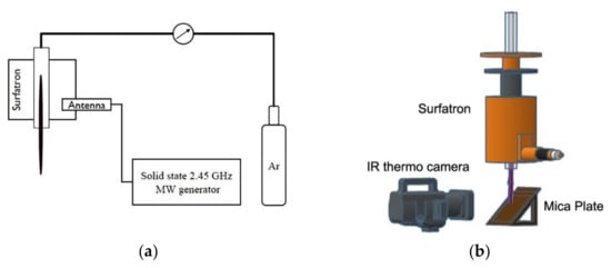 Experimental set-up: (a) surface-wave sustained argon plasma torch; (b) Mica Plate and infrared thermo camera system.