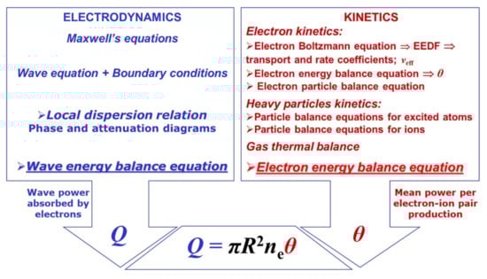 The surface-wave discharge plasma is sustained by an electromagnetic wave propagating along the plasma–dielectric interface in a waveguide structure, including also the sustained plasma. This requires a self-consistent model for describing the wave–plasma system. The self-consistent model includes a kinetic part describing the elementary processes inside the plasma and an electrodynamic part for the wave propagation based on Maxwell’s equations. These two parts are linked in a self-consistent way by the energy balance equations of the electromagnetic wave and the electrons in each point along the plasma torch because the plasma is axially inhomogeneous. The self-consistent approach used in this paper is schematically presented in Figure 3.