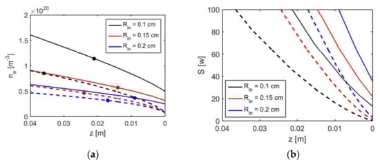 The axial distribution of the plasma density ne obtained theoretically for the three discharge tubes 8/2, 8/3 and 8/4 (see Table 1) is presented in Figure 5a—solid lines. The plasma torch where plasma is surrounded by air is presented by dashed lines. The corresponding wave power can be seen in Figure 5b. The length of the plasma torch also increases with the wave power. The torch length produced with the same wave power (100 W) is marked by dots in Figure 5a. One can see that the theoretical prediction obtains a longer plasma column with a higher plasma density at the same wave power in the discharge tube with the smaller inner radius. Respectively, the plasma column with the same length is produced in the discharge tube with a smaller inner radius by a lower wave power. The plasma torch is longer, but with a lower electron density compared to the plasma inside the dielectric tube with the same wave power. From Figure 5b, one can see also that at the end of the plasma column inside the dielectric tube, the microwave power is not completely absorbed, and the residual power is higher at a smaller internal tube radius. At the end of the plasma torch (dashed lines), the residual microwave power is much lower.