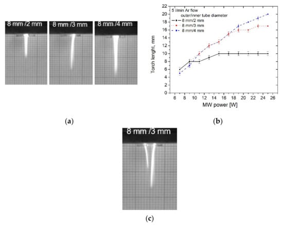 The experimental set-up is schematically presented in Figure 2a. A simple surfatron-type wave launcher is used for plasma sustaining. The surfatron (Sairem, SURFATRON 80) is connected with a solid-state microwave generator at 2.45 GHz (Sairem, GMS 200 W) by a coaxial cable. The plasma is produced inside the discharge tube situated at the surfatron axis. Various quarts tubes with different outer and inner diameters (Table 1) are used. For all of them, the real and imaginary parts of the dielectric permittivity are εr = 5.58 and εi = 0.036, respectively. The discharge tubes end is fixed at 2 mm out of the surfatron, and the plasma torch is formed out of the discharge tube in the air. The working gas is argon 5.0 (purity of 99.999%), and its mass flow is controlled by Omega FMA-A2408 mass flow controller. The system is vertically installed with the gas flow from top to down.