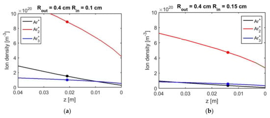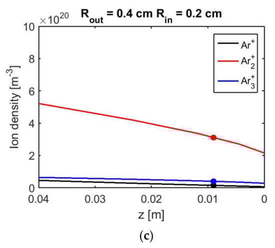 Axial distribution of argon atomic ion Ar+ (balck lines) and two molecular ions Ar2+ (red lines) and Ar3+ (blue lines) along the plasma column in the three discharge tubes: (a) 8 mm/2 mm; (b) 8 mm/3 mm; (c) 8 mm/4 mm. The dots correspond to the same wave power as in Figure 5a.
