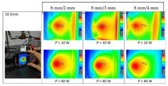 For this investigation, the argon flow rate is varied from 2 L/min to 15 L/min for the three tubes. The temperature is measured by a contact thermometer and by the Mica Plate and infrared thermo camera system. Figure 8 illustrates the latter experiments and obtained images used for the temperature estimation at an argon flow rate of 10 L/min. Similar images are obtained at all the other discharge conditions.