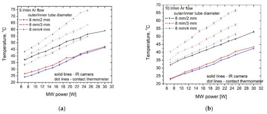 Figure 9 demonstrates the effect of the discharge tube inner diameter on the temperature at fixed gas flow rate. In Figure 9a, the gas flow rate is 5 L/min and in Figure 9b it is twice higher, 10 L/min. The temperature measured by the contact thermometer is always higher than that obtained by the IR camera. We observe that the temperature of the plasma is lower than the temperature of the not ionized Argon in the tube and ambient gas outside it. By the contact thermometer, the average temperature of the plasma and ambient gas is measured, while infrared thermography determines only the average plasma temperature, ignoring the carrying gas temperature.