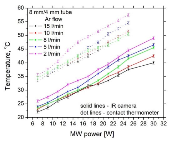 Both methods show that the lower temperature is obtained by using the discharge tube with a bigger inner diameter, i.e., 8 mm/4 mm. For this tube, even at 20 W wave power, the temperature does not exceed 45 °C, measured by the contact thermometer. Similar results are obtained for all the other gas flow rates, i.e., the best performance is shown for the 8 mm/4 mm discharge tube. More detailed dependance of the temperature on the gas flow rate for the 8/4 discharge tube is shown in Figure 10.