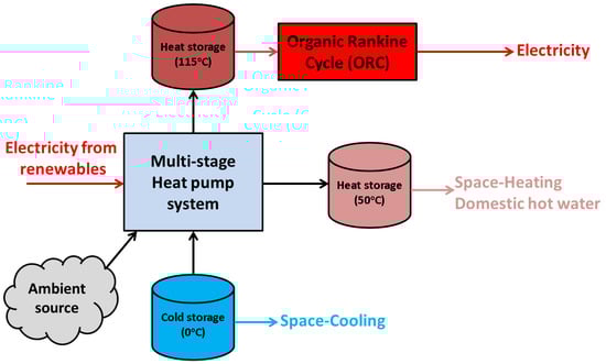 The present work outlines the idea of exploiting volatile electricity from renewables in order to convert it into three useful products that can be properly stored. Figure 1 demonstrates this idea with a simplistic depiction. The core of the system is a multi-stage heat pump that is fed by the ambient source and from cold input which is responsible for the cooling loads. The heat pump rejects heat to the medium temperature level, around 50 °C, in a heat storage system for space-heating purposes and/or domestic hot production. Furthermore, the heat pump is able to produce high heating temperatures, e.g., around 115 °C, for high-temperature storage. This high quantity can be used in an ORC for electricity recovery when there is a need. At this point, high-temperature thermal storage can also be used in alternative applications such as industrial processes (e.g., drying), but it is not in the scope of the present work which focuses on building applications.