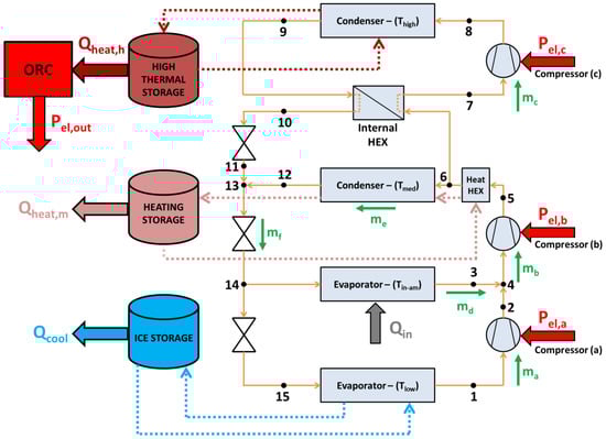 The next step in this study is the description of the multi-stage heat pump, as well as the total configuration in detail. Figure 2 shows the total configuration, while Figure 3 describes the regenerative ORC. According to Figure 2, the suggested heat pump has three compressors and operates at four temperature levels: the low temperature (Tlow), which is 5 K lower than cold storage; the (Tin-am), which is 5 K greater than the ambient temperature; the (Theat,m), which is 5 K greater than the medium storage temperature; and the (Theat,h), which is 5 K greater than the high thermal storage temperature. These temperature differences of 5 K are selected as typical values for efficient and proper heat transfer.