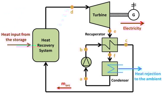 The examined organic Rankine Cycle (ORC) with recuperator.
