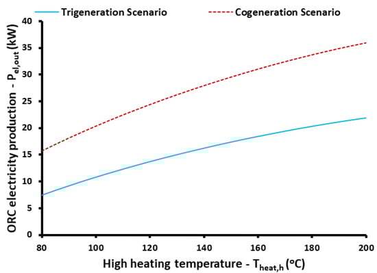 The first examined parameter is the high heating temperature, which is a critical design parameter. Very high temperatures (above 130 °C) lead to manufacturing restrictions and increased costs. However, according to Figure 4, the increase of this parameter increases electricity production from the ORC for both scenarios (trigeneration and cogeneration). This is a reasonable result in accordance with the “Carnot rule”, which indicates that greater cycle temperature leads to higher cycle thermodynamic efficiency. Figure 5 also validates the aforementioned analysis.
