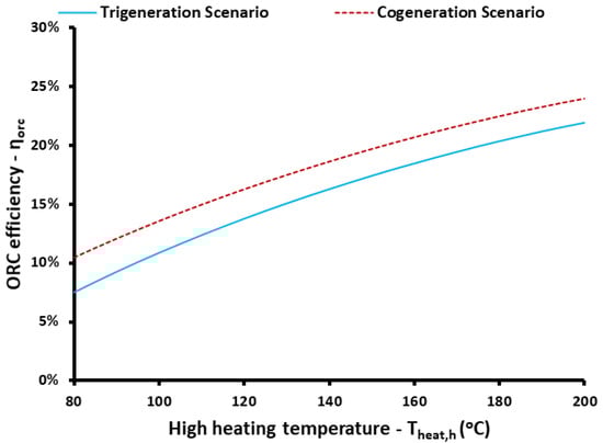 Recall that the data about the trigeneration and cogeneration scenarios appear in Table 1. The ORC performance is higher for the cogeneration scenario because of the lower ambient temperature for this case (winter with Tam = 10 °C). It is worthwhile mentioning that when the high heating temperature increases from 80 °C to 200 °C, the ORC efficiency increases from 7.47% to 21.90% for the trigeneration scenario and from 10.46% to 23.99% for the cogeneration scenario.