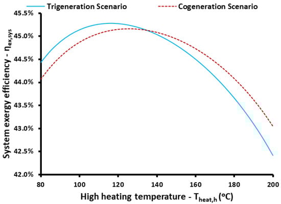 The next studied parameter is the system exergy efficiency, shown in Figure 6. The exergy efficiency of the trigeneration scenario is maximized for Theat,h = 115 °C at 45.28%, while for the cogeneration scenario, it is maximized for Theat,h = 125 °C at 45.17%. The global maximum exergy performance of the trigeneration scenario is greater than the respective value of the cogeneration because there is better exploitation of the input electricity when there are three useful outputs. Moreover, it can be said that for temperature levels up to 135 °C, trigeneration has higher exergy efficiency, but after this limit, the cogeneration scenario is more efficient.