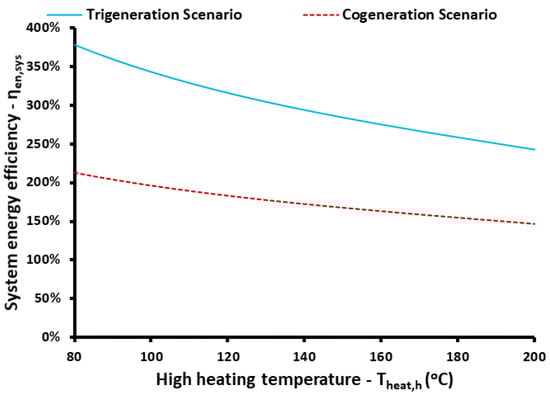 The impact of high heating temperature on system energy efficiency for both trigeneration and cogeneration scenarios.
