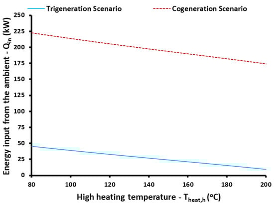 The impact of high heating temperature on energy input from the ambient for both trigeneration and cogeneration scenarios.